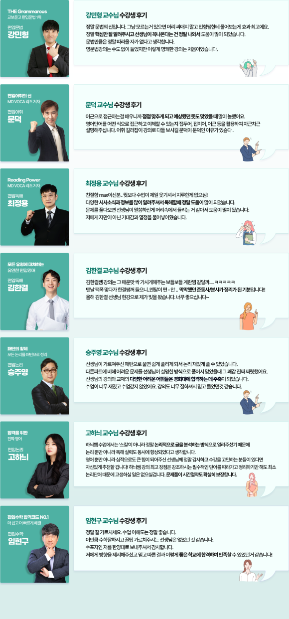 편입영어, 편입수학에서 다루는 모든 범위를 이론부터 실전문제풀이까지 최신 경향을 반영해 강의하고 있고 학생들과의 소통도 활발히 하셔서 인강 수강생이라고 하더라도 수업과 생활 모두 철저히 관리해주고 계십니다.