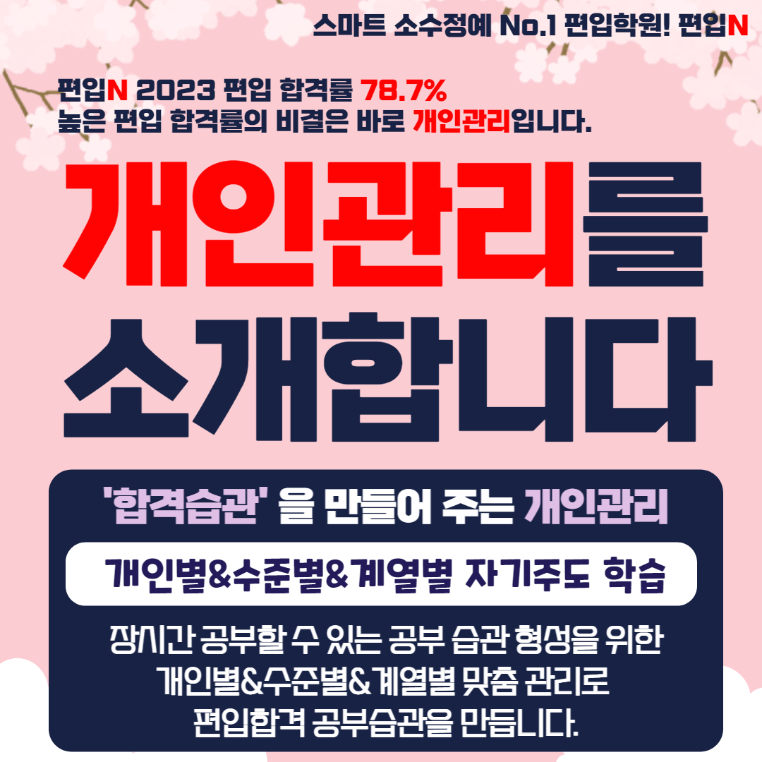 본격적으로 노원편입학원 편입N 학원의 개인관리 프로그램 소개해드려볼게요. 개인관리가 가능한 가장 기본적인 이유는 소수정예방식으로 운영하는 학원이기 때문입니다. 관리해야 할 학생이 많지 않기 때문에 학생 한명 한명의 상태를 잘 알게되고 적절한 방식의 공부방향을 제안해줄 수 있는거고요. 편입N 노원편입학원의 관리프로그램은 개인별, 수준별, 계열별로 철저히 학생들의 현재 수준에 맞춰서 진행되고 있어요.