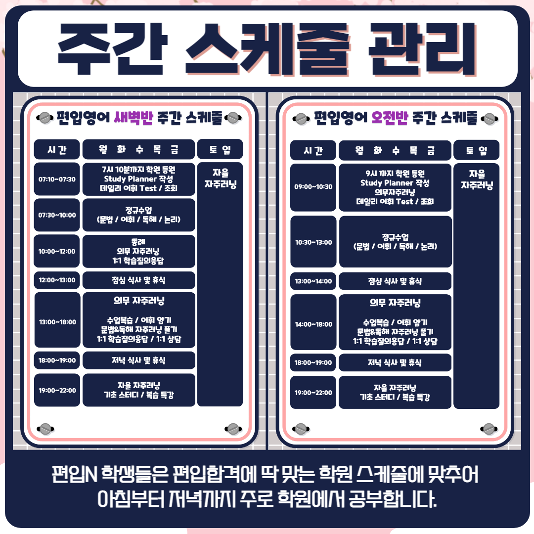 편입N 노원편입학원이 스파르타 컨셉의 학원은 아니지만 기본적으로 주간 스케줄이 제공되고 있습니다. 그 시간에 무엇을 해야하는지 큰 틀에서 정해져 있다고 할 수 있는데 큰 틀만 같을 뿐 해당 시간에 어떤 과목을, 어떤 방식으로 얼마의 시간 동안 공부해야 하는지는 개인별로 전부 달라집니다. 원장님이 직접 스케줄을 관리해주고 계십니다. 예를 들어서 오후에 4시간 동안 진행되는 자주러닝 시간에 문법이 부족한 학생은 문법공부를 2시간 이상하고 나머지 시간을 다른 과목을 공부할 수 있도록 한다거나 독해가 약한 학생은 독해를 더 많은 시간 공부한다거나 이런 식으로 학생 한명 한명의 공부를 관리해주고 있는 곳이 노원편입학원 편입N 입니다.