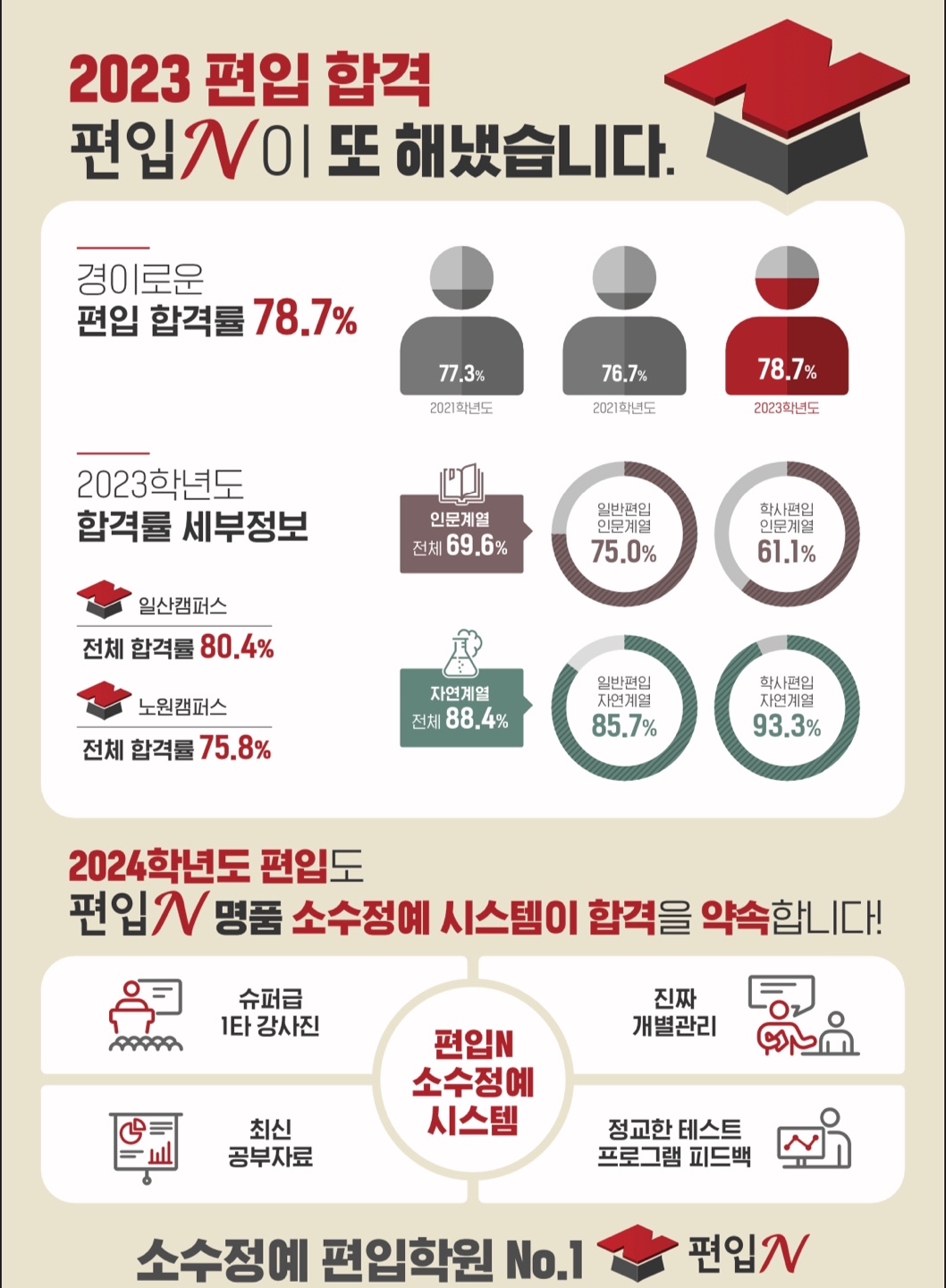 편입N 노원편입학원이 발표한 포스터처럼 정말 경이롭다고 할 수 있는 합격률이네요. 합격률 78.7%! 모든 편입학원 중에서도 재원생 대비 가장 높은 합격률을 기록한 것 같아요. 학원생들의 노력도 대단했겠지만 그 노력을 끝까지 유지할 수 있게 해준 학원의 강사진, 공부자료, 관리능력은 이 수치로 더이상 설명이 필요없다는 생각이 들기도 합니다.