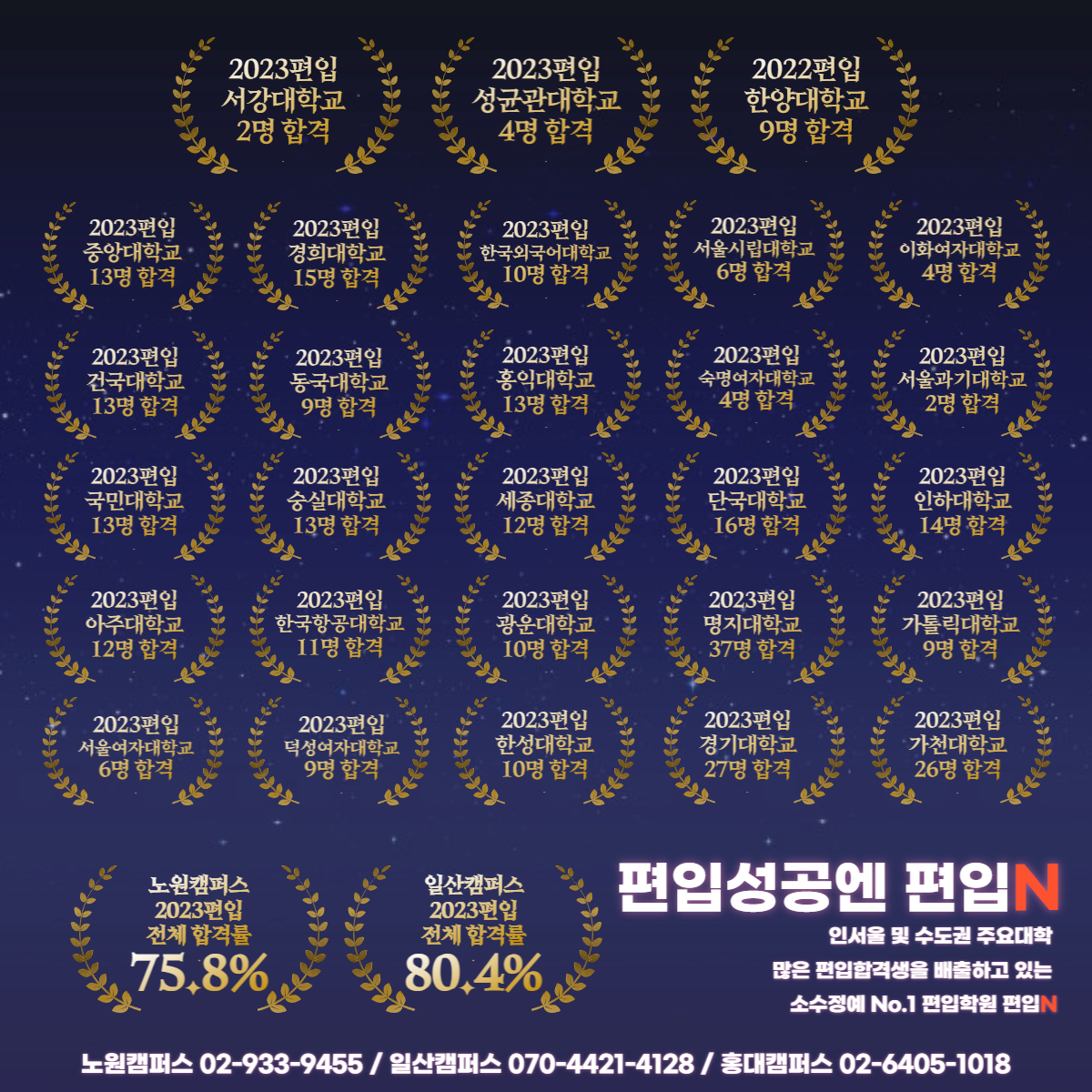 | 일산편입학원 편입N 자연계편입 합격률 96.4%! 공대편입 여기서 준비하세요! (0) | 2023.03.05 |