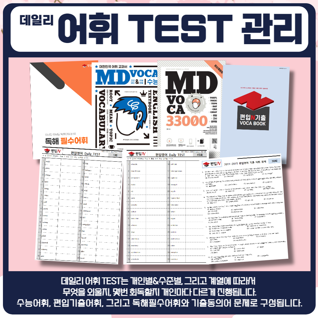 어휘 관리 역시 개인별로 이뤄집니다. 노원편입학원 편입N은 독해필수어휘, MD보카수능, MD보카33000, 편입기출 어휘 등의 교재로 어휘를 관리하고 있는데 학생 한명한명의 암기 정도에 따라서 범위와 분량, 테스트 형식이 전부 다르다고 생각하시면 됩니다. 학생 수준에 맞춰서 관리가 이뤄지고 있어요. 당연히 암기 효율이 높을 수밖에 없을거고 편입영어에서 어휘가 차지하는 비중을 고려할 때 이 같은 어휘테스트 관리 프로그램이 높은 합격률을 유지하는 비결이라고 할 수 있을 것 같고요. 합격생들이 후기에서 이야기하는 것처럼 잘 따라오기만 해도 어휘 암기는 걱정없을 것 같아요.