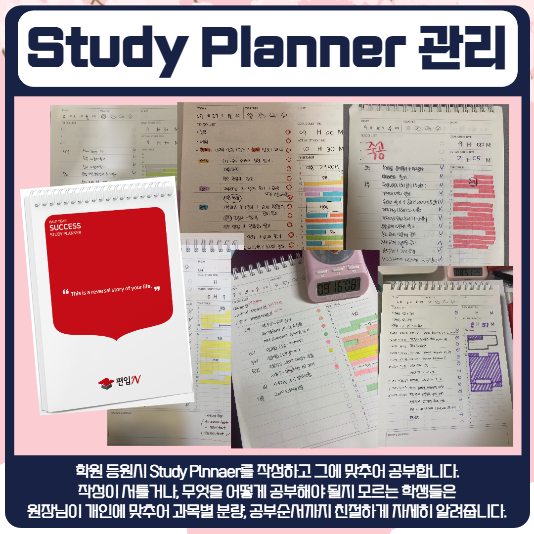 주간 스케줄에 부여되는 과제는 스터디플래너 작성과 관리에서부터 시작됩니다. 노원편입학원 편입N 수강생들은 등원시 모두 하루에 어떤 공부를 할지 계획하는데 이걸 원장님이 일일이 다 봐주고 계십니다. 물론 처음 작성하거나 어떻게 공부해야 할지 감을 잡지 못하는 학생들도 있는데 이것도 걱정하지 않으셔도 되는게 원장님이 함께 작성해주고 있어요. 계획 없는 공부는 적합한 시험준비가 아닙니다. 마구잡이 공부에 불과하죠. 부족한 것을 보완할 수 있도록 계획적으로 공부해야 한다는 점에서 아주 좋은 프로그램인 것 같아요.