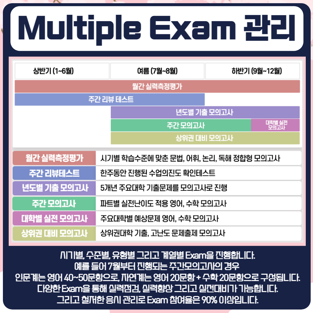 편입은 시험이라는 점을 기억해야 합니다. 어느 정도 공부해야 할 범위가 존재하고 시험준비는 그 시험의 출제경향에 맞춰 고득점할 수 있는 방법을 학습해나가는 과정입니다. 고득점할 수 있는 방법은 단순합니다. 모르는 것을 아는 상태로 만들고, 모르는 것을 찾아내서 보완해내는거죠. 그러기 위해서는 모의고사가 필수적인데 노원편입학원 편입N은 시기별, 수준별, 유형별, 계열별 등 편입학에 딱 맞는 시험관리를 해주고 있어요. 응시율도 아주 높죠. 학생입장에서는 객관적으로 자신의 위치를 파악할 수 있는 시스템입니다.