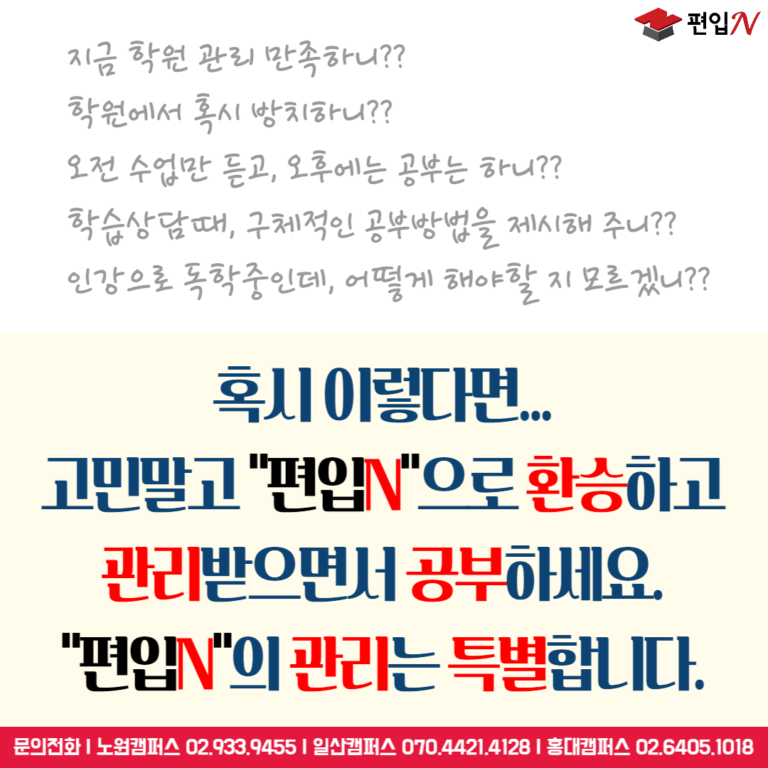 이런 분들 정말정말 많이 봅니다. 학원 관리가 맞지 않고 불만족스러운데도 편입을 준비해야 해서 어쩔 수 없이 수강하는 분들, 학원에서 방치되고 소외되는 느낌을 받는 분들, 수업 이외에 별다른 상담이 없고 상담을 해도 열심히 하라는 내용의 상담을 받는 분들.. 그리고 결국 후회를 하죠. 일산편입학원 편입N은 정말 매일매일 원장님이 공부한 것들 다 점검합니다. 성적에 따라서 어떻게 공부하라고 수시로 조언해줍니다. 아무래도 이 점은 원장님이 유명학원 강사출신이기 때문에 가능하기도 하지만요.