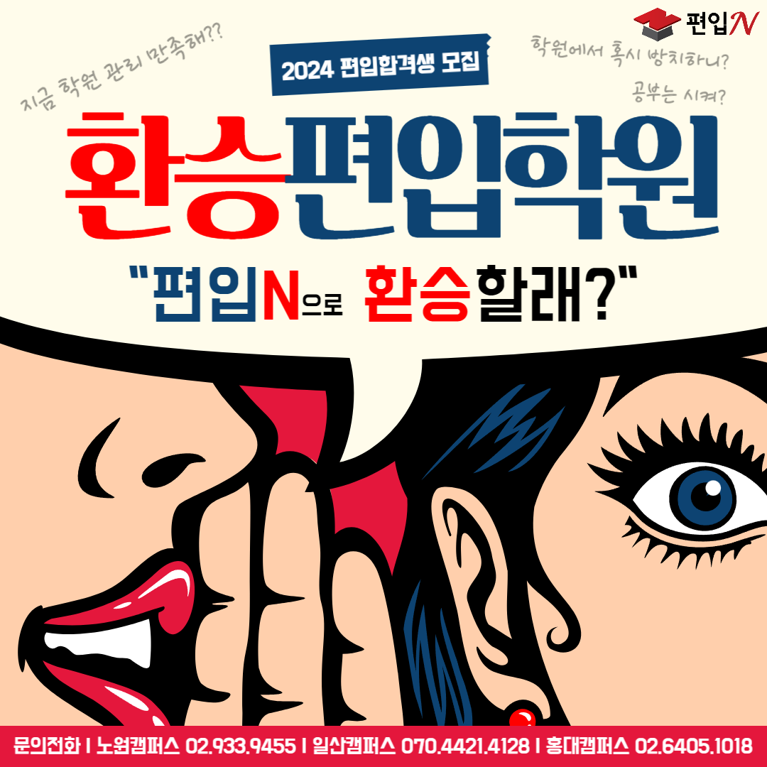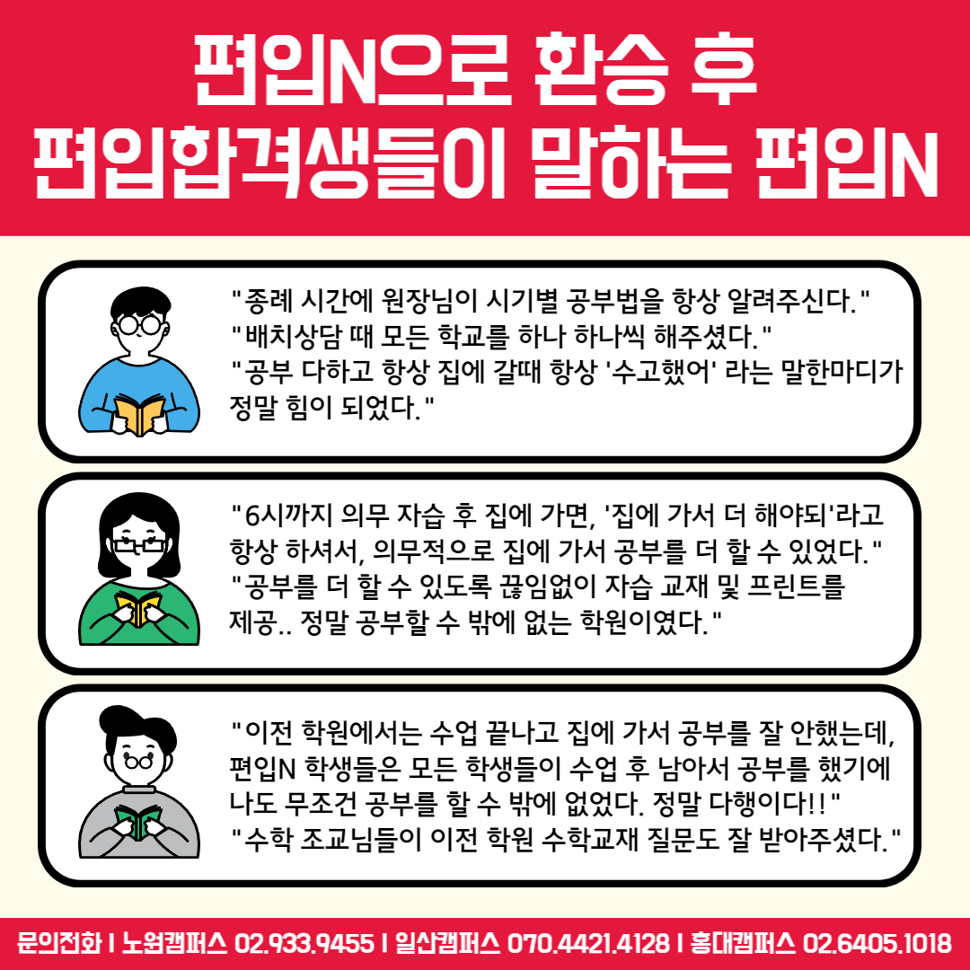 작년에도 이 시기에 편입N 학원 말고 다른 일산편입학원을 다니다 옮겨온 수강생들이 많았는데 결과는 아주 좋았죠. 한양대, 이화여대, 홍익대 등 거의 전원이 합격했습니다. 확실히 편입N 학원이 성적을 올리고 합격시키는 노하우가 있는 것 같아요. 지금 다니는 편입학원이 불만족스럽다면 먼저 상담부터 받아보세요. 아래쪽에 상담신청 링크 남겨드릴게요. 현재와 다른 모습을 기대하고 있다면 바꿔야 합니다. 현재와 같은 모습으로 공부한다면 아무 것도 바뀌지 않아요!