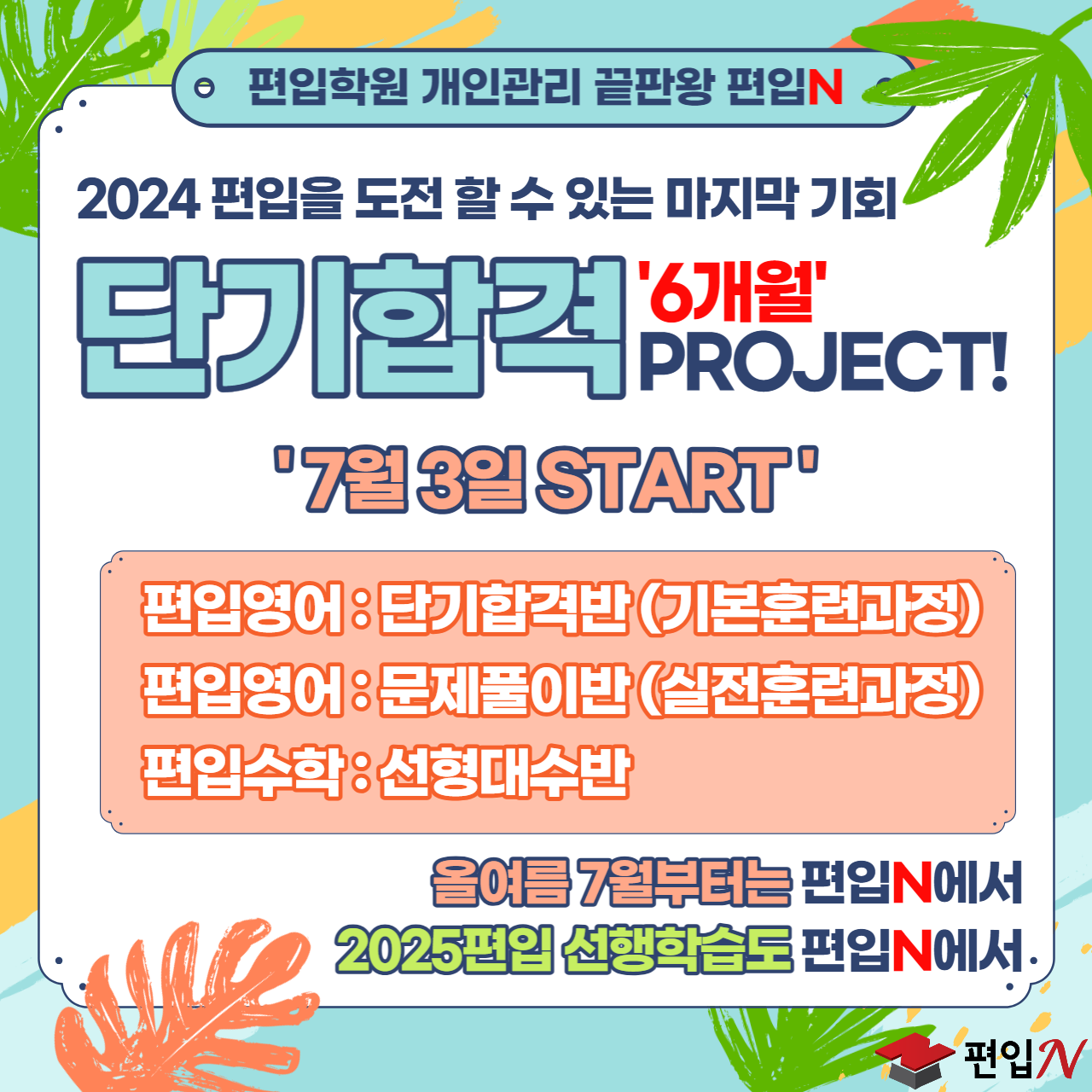 편입N 일산편입학원 단기합격과정 개강은 7월 3일 입니다. 편입영어는 기본과정과 실전과정, 편입수학은 선형대수 과정이 개설됩니다. 현재 준비되어 있는 정도에 따라서 적합한 과정을 수강하면 되는데 사실 이것보다 더 중요한게 결국에는 개인공부를 어떻게 해나갈 것인가입니다. 수험생 모두가 갖추고 있는 실력이 다르기 때문에 과목별 비중과 학습시간 등이 다를수밖에 없어요. 편입N 일산캠 수강생들은 이 부분이 전부 다르다고 보시면 될 것 같아요. 원장님이 1:1로 방향 다 잡아줍니다. 이게 높은 합격률의 비결이기도 하고요.