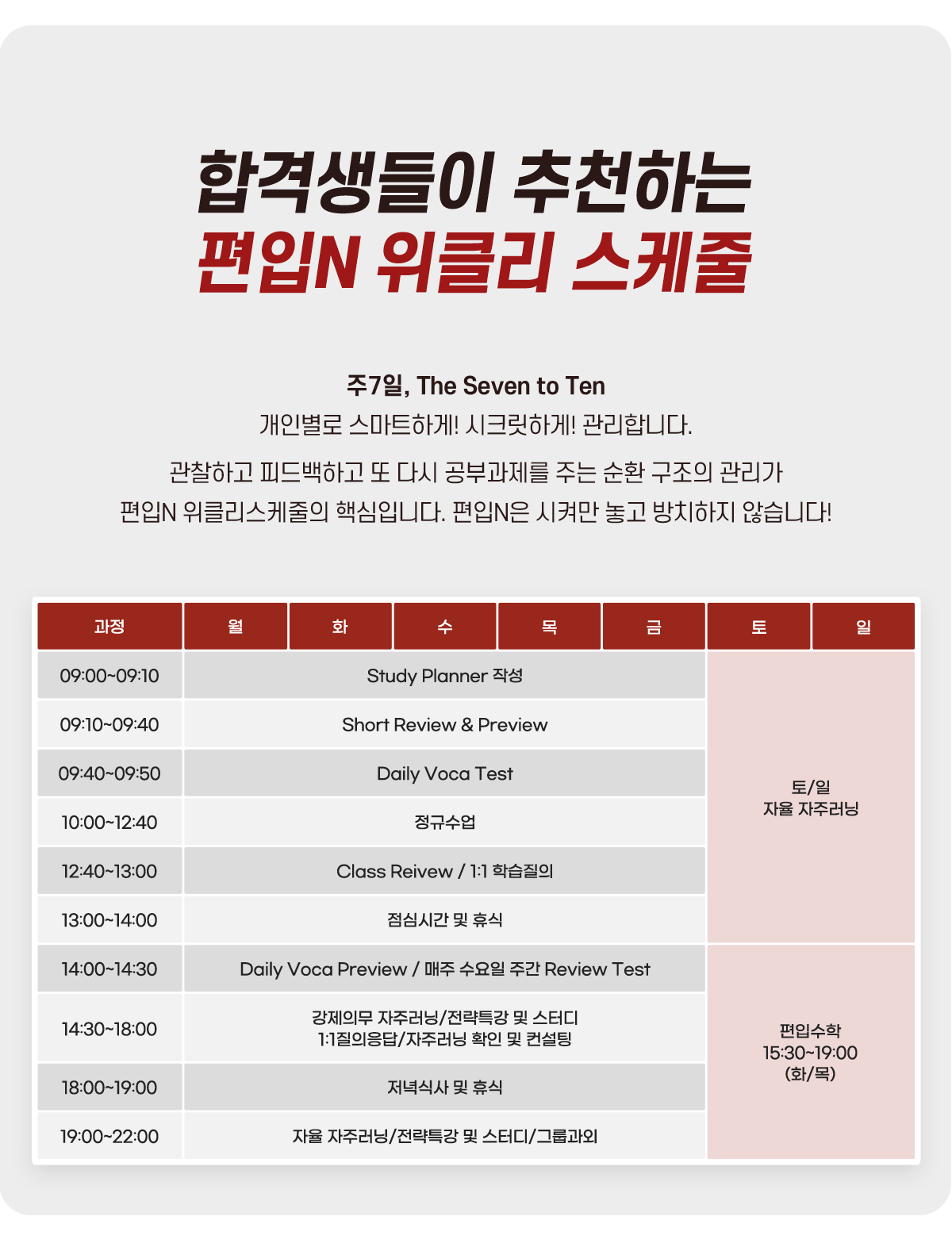노원편입학원 편입N 수강생들은 겨울방학 기간 동안 학원이 제시하는 위클리 스케줄을 따라서 공부해야 합니다. 초기 단계는 기본기를 익히는 시기일 뿐아니라 수험생활 동안 유지할 학습습관을 기르는 시기이기도 합니다. 원장님이 스케줄러부터 공부방향과 공부과정을 1:1로 관리해주니까 확실한 기본기와 학습습관을 기를 수 있어요!