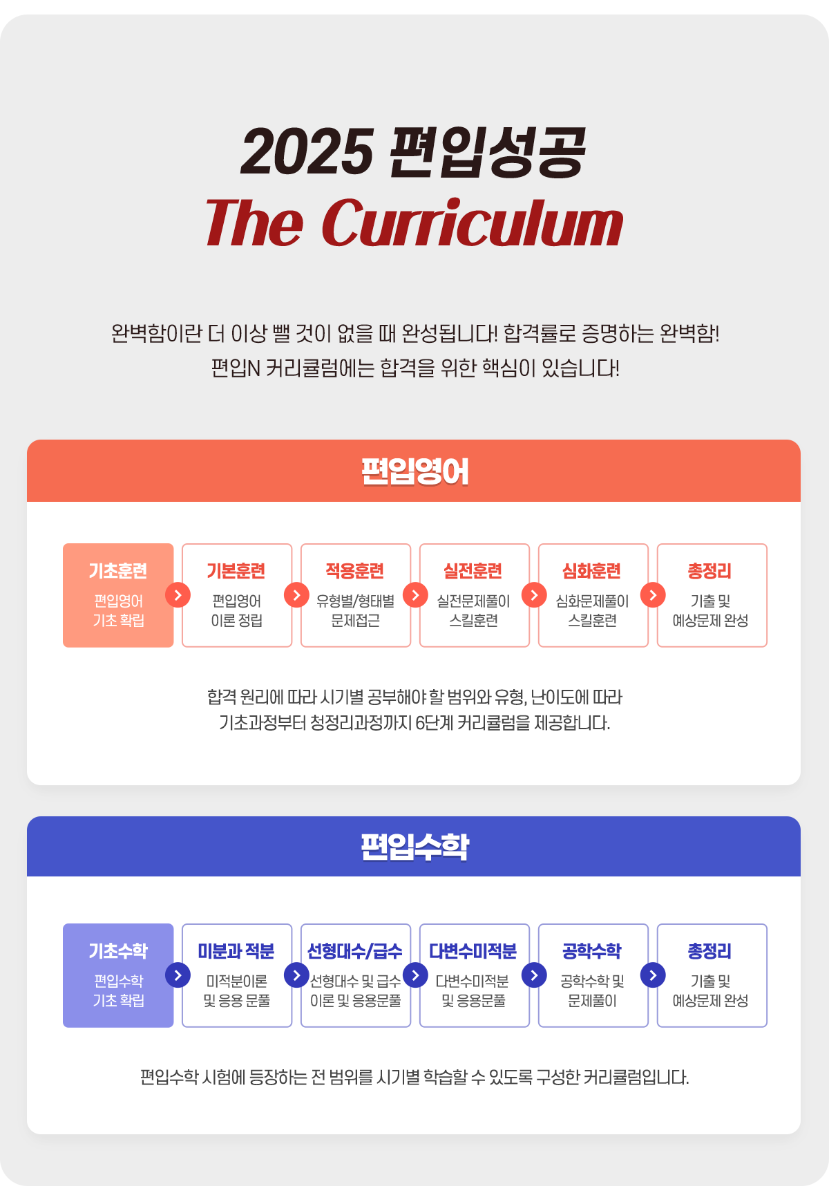노원편입학원 편입N 학원은 기초과정부터 총정리과정까지 합격이 가능한 수준을 완성하기 위해서 시기별로 공부해야 할 범위와 유형 난이도에 따른 커리큘럼을 갖추고 있습니다. 학습자가 별도로 준비할 필요없이 학원이 제시하는 스케줄에 따라 그냥 공부만 하면 되겠네요.