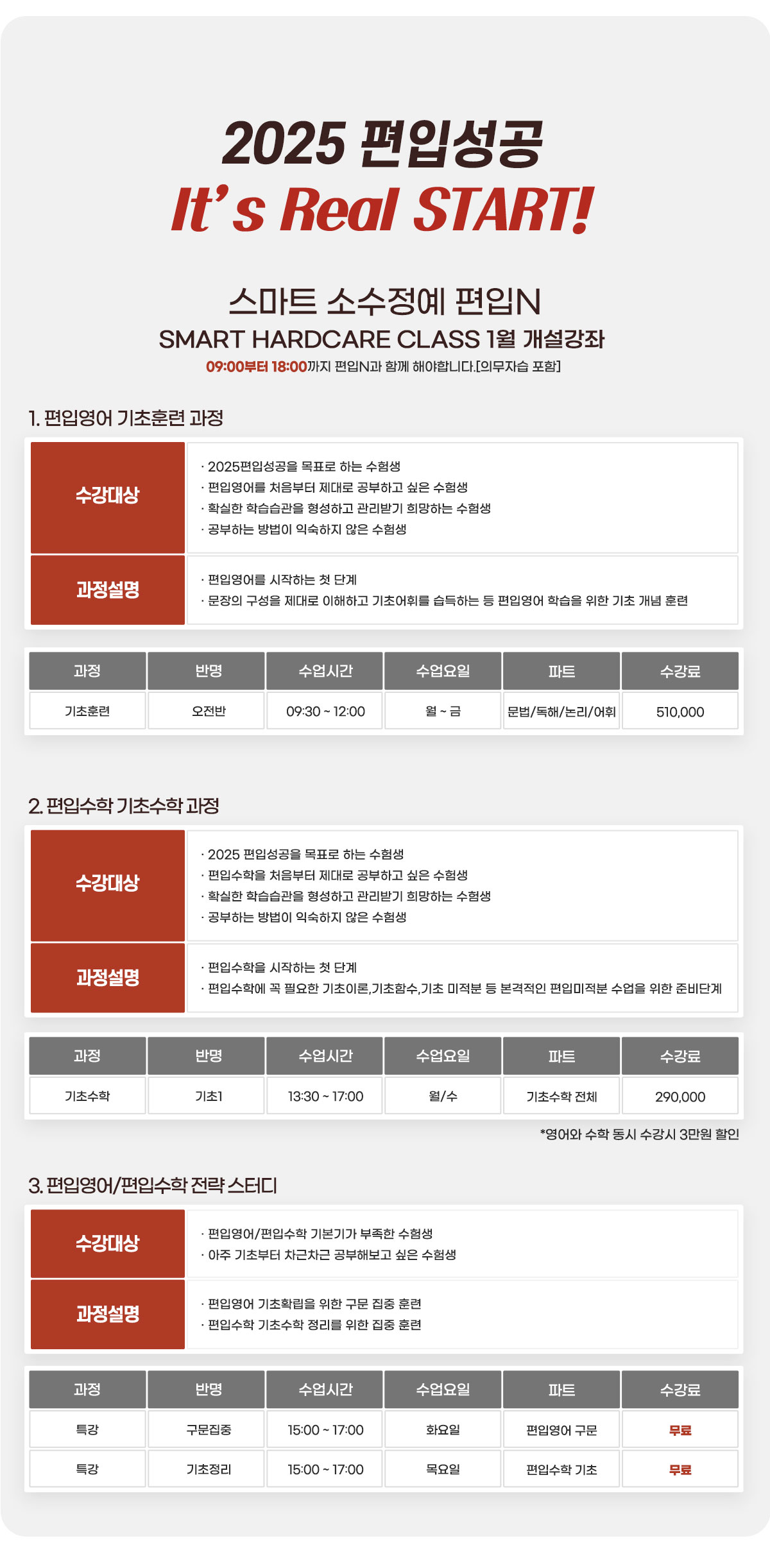 소수정예 노원편입학원은 2025년 대비 편입과정을 개강하면서 다양한 수강료 할인이벤트를 제공하고 있네요.