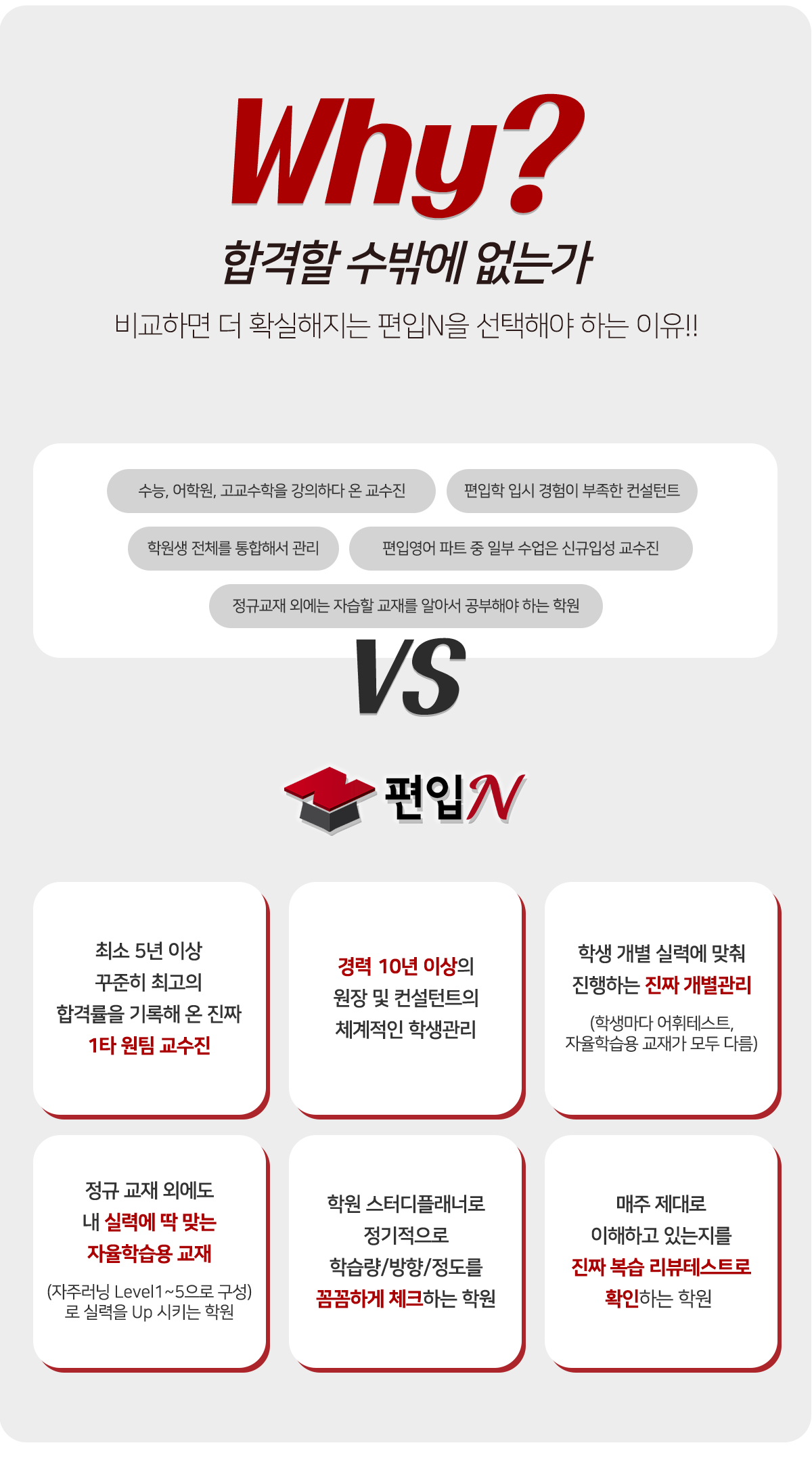노원편입학원 편입N 학원이 합격률이 높을 수밖에 없는 이유는 편입학 입시에서만 강의해온 1타급 강사진을 보유하고 있기 때문입니다. 인서울대학 시험이 대학별로 자체적으로 문제를 출제하고 시행되고 있기 때문에 충분한 노하우와 연구 없이 경향에 맞춰 강의하기 어려운 점이 있는데 편입N 강사진은 많은 강의경력으로 갖고 있어서 최신 경향에 맞는 공부를 할 수 있습니다. 원장님을 컨설턴트 역시 마찬가지입니다. 10년 이상 편입 입시를 지도한 베테랑분들이시고 이분들이 1:1로 공부관리를 해주고 있습니다.