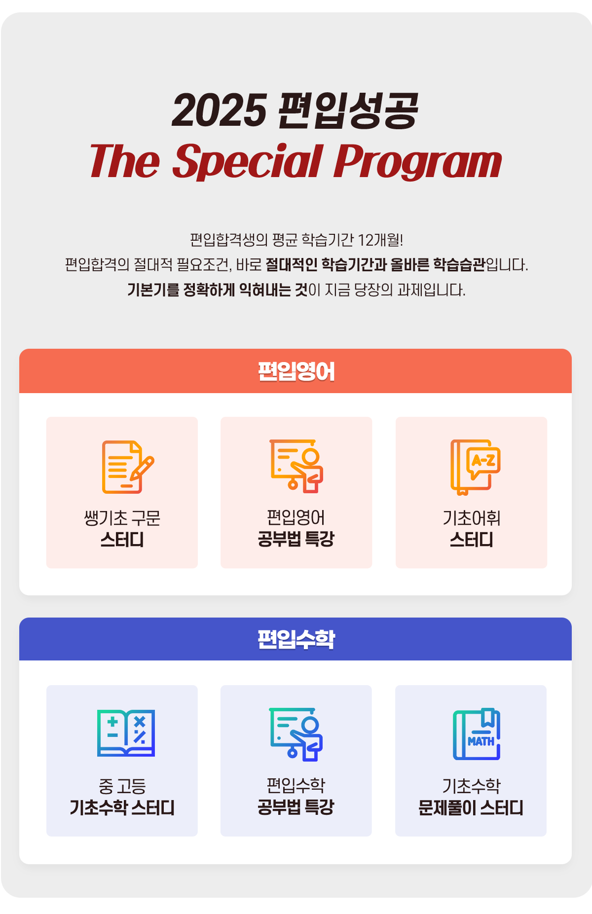 노원편입학원 편입N 학원에서는 2025편입을 준비하는 노베이스 학생들을 위해서도 정규강좌 이외에 기초적인 내용을 공부할 수 있는 특별한 프로그램을 운영합니다. 편입영어 프로그램은로는 생기초구문과 기초스터디, 공부법특강, 편입수학은 중고등기초수학스터디와 수학공부법 특강이 진행됩니다.