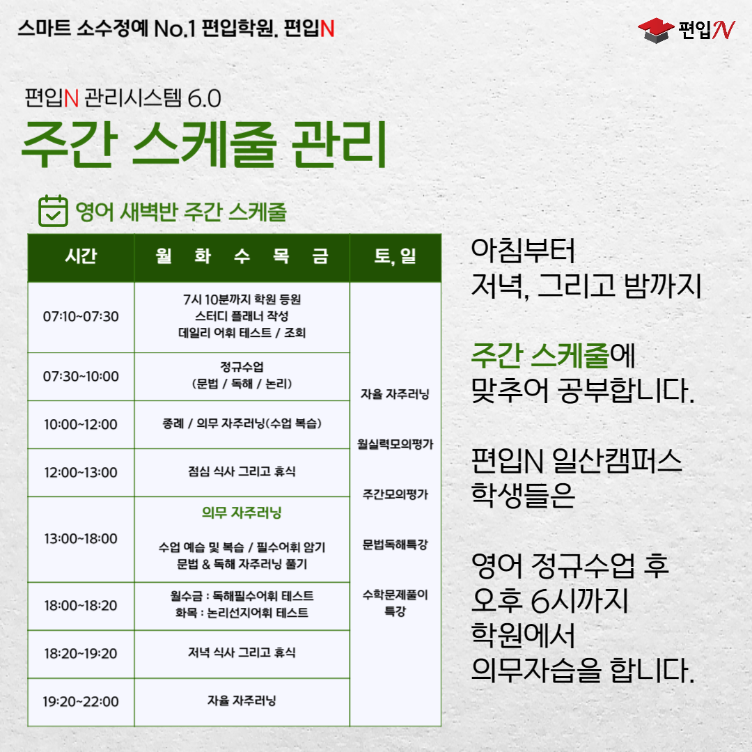 강남편입학원에는 다양한 지역에서 많은 분들이 공부하고 있습니다. 강남구를 비롯해서 서울 각지, 경기 남북부권까지 접근성이 좋아서 여러 지역에서 상담을 오고 있습니다. 편입학원도 여러개 많이 있는데 그중에서도 편입N 학원을 추천해드리는 이유는 개별관리 노하우가 높다는 점입니다. 개인별로 관리를 하고 있기 때문에 다양한 케이스에 있는 분들도 상황에 맞는 준비방법을 안내해줄 수 있습니다. 편입조건이 다양한 만큼 더 효율이 높은 방법을 찾고 시행착오를 줄여야 하는데 편입N 학원이 잘하는 부분이 이런거라고 생각하시면 됩니다. 또 편입N 강남편입학원에서는 빠른 시간내에 수준 진단을 할 수 있습니다. 기본기를 갖추고 있는 사람과 그렇지 않은 사람에게 동일하게 공부를 시키면 안되겠죠. 이건 학습자도 그렇고 학원도 그렇고 서로 망하는 길입니다. 수준 진단 후 부족한 부분을 보완하는 방법과 편입준비 방향도 상담시에 안내받을 수 있어요. 강남편입학원을 다녀야 하는 분들은 꼭 편입N 학원에서도 상담받아야 하는 이유입니다.