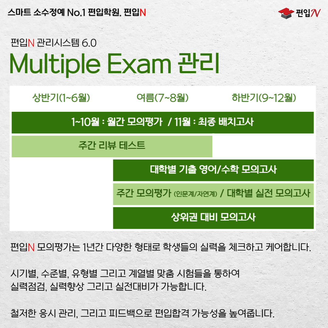 편입제도는 단순합니다. 대학이 정한 날짜에 대학이 출제한 시험에 응시하면 되기 때문입니다. 간단히 접근한다면 이게 끝입니다. 하지만 편입을 준비하시는 분들, 합격이 목표이신 분들은 더 구체적인 편입조건 확인이 필요합니다. 결과적으로 대학별로 편입조건을 확인해야 하는데 분산된 정보로는 제대로 된 합격 전략을 수립할 수가 없어요. 체계를 만들고 그룹핑이 되어야 자신에게 맞는 편입조건을 이해할 수 있습니다. 또 잘못된 방향으로 접근할 경우 그만큼 경쟁에서 뒤쳐지겠죠. 처음부터 확실하게 편입N 강남편입학원에서 시작하세요!