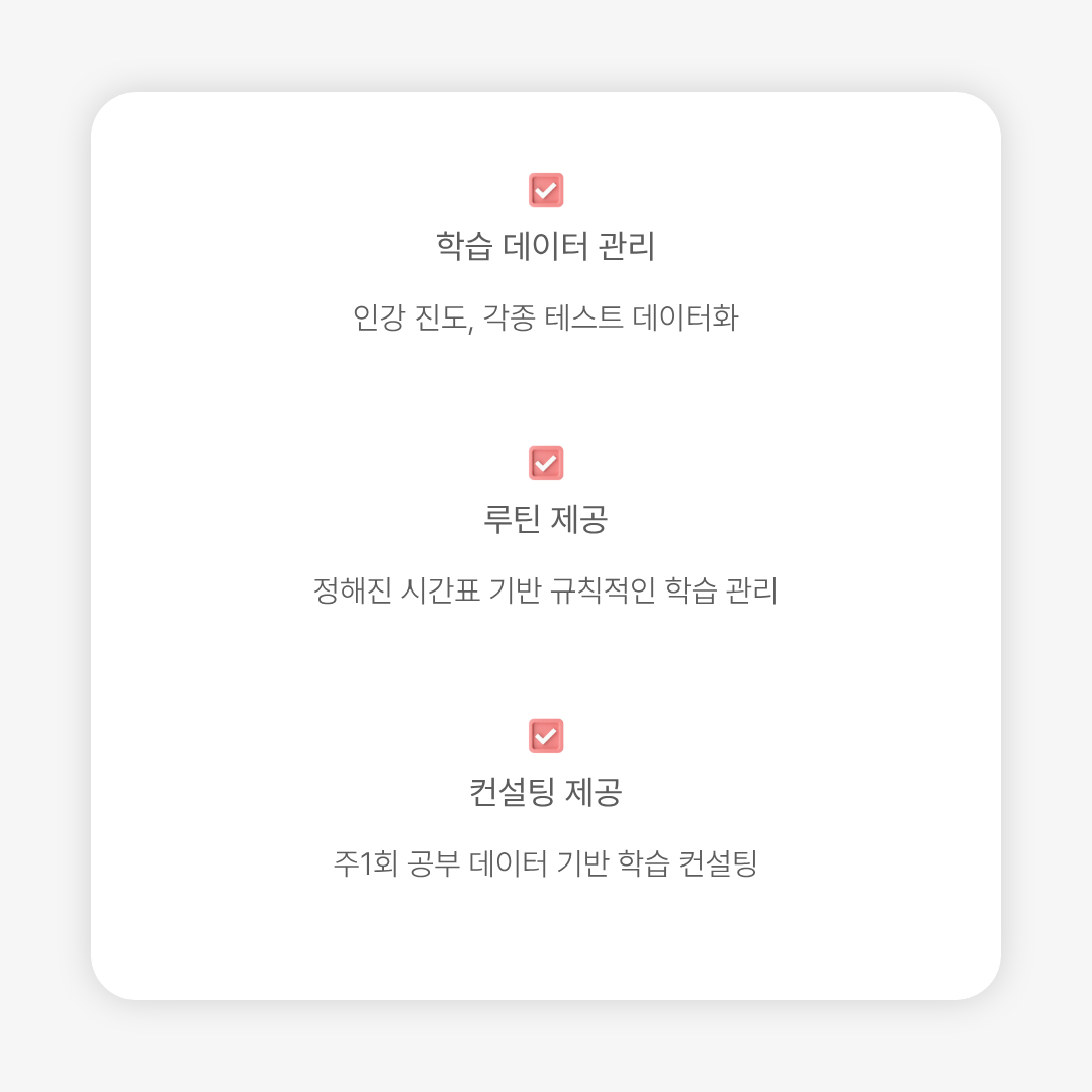 학습 모니터링, 출결관리, 질의응답, 루틴 미이행자 관리, 학습 결과물 데이터화, 지속적인 피드백이 포함되어 있습니다.